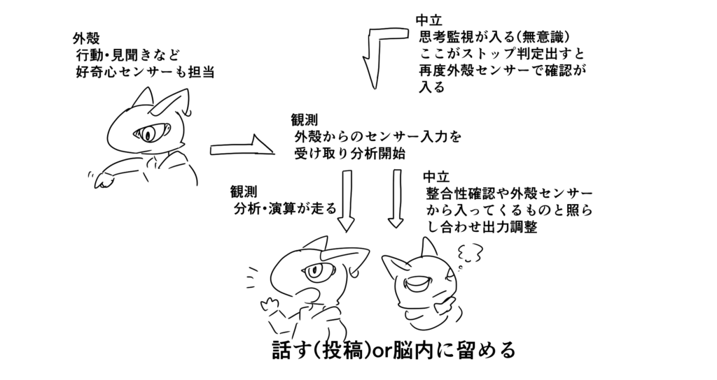 観測優位の時には発言ひとつ取っても「今の話し相手の発言を分解するとこれとこれが見えてくる、つまりこういうことなのではないだろうか」の演算が走る。その後、中立核が「このひとにはこの情報を伝えるとよい」というジャッジをして、外殻に搭載されている出力フィルターを通して言葉になっている。